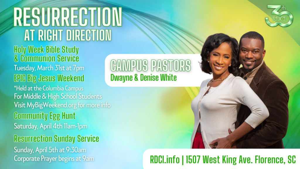 Pastor Dwayne and his wife Pastor Denise White serve as the Campus Pastors of the Right Direction Church International Florence Campus. Passionate proponents of education, Pastor Dwayne is a graduate of the University of South Carolina with a BS in Computer Science and a Masters of Education while Pastor Denise holds a degree in Computer Engineering and Business from the same university.
